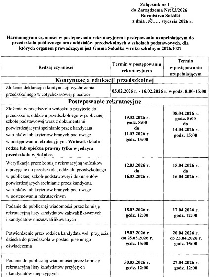 Harmonogram przeprowadzenia postępowania rekrutacyjnego i postępowania uzupełniającego do przedszkoli, oddziałów przedszkolnych w szkołach podstawowych, innych form wychowania przedszkolnego, dla których organem prowadzącym jest Gmina Sokółka na rok szkolny 2026/2027.