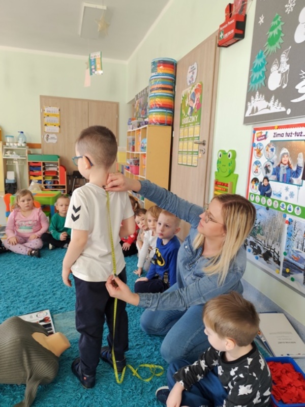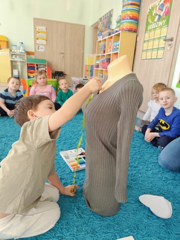 Była to fascynujące zajęcia, podczas których dzieci rozpoznawały akcesoria krawcowej, takie jak: manekin, igła, nitka, nożyce, materiały.